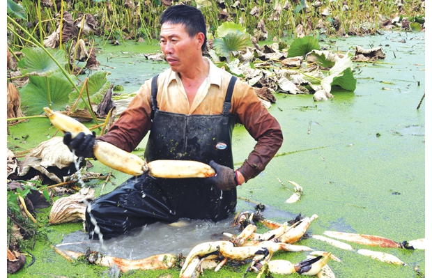 随州网讯 随州市随县厉山镇同心村引种的300亩优质白莲藕日前进入采摘期。该藕采用沼液作肥料,味甘清香,受到市场青睐。 (记者 孙洪涛 通讯员 龚承斌摄)