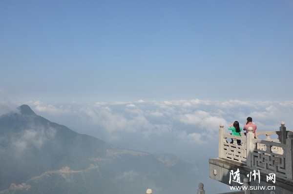 随州网讯  近日,雨后初霁的大洪山,云蒸霞蔚蔚为壮观。图为游客在宝珠峰金顶观赏云海。 (通讯员 贺晓利摄)