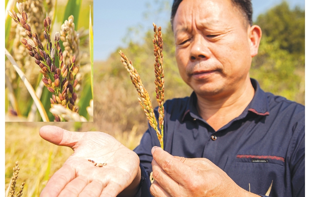 随州网讯 今年,宫保贵在随县高城镇大桥村试种彩色水稻,目前已经成熟,预计亩产可达500公斤。图为10月14日宫保贵向记者展示彩色水稻,该水稻成熟后,稻壳由紫红色变成黄色,米粒为紫褐色。(记者 徐斌 摄)