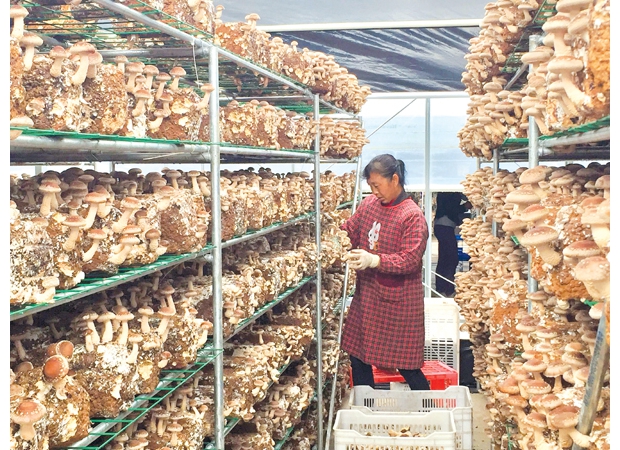 随州网讯 湖北炎帝科技公司今年新建成的数十个智能温控大棚投入使用,这种大棚出菇量大,质量高,污染少,每个棚可出3茬,头茬可出菇16吨。(记者 徐斌摄)
