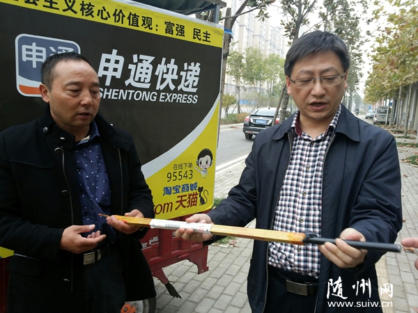 随州网讯   1至10月底,随州市邮政管理局共查堵非法寄递违禁品6起。图为市邮政管理局负责人和快递公司人员查验堵截的枪管违禁品。(记者 周强 通讯员 胡高峰摄)