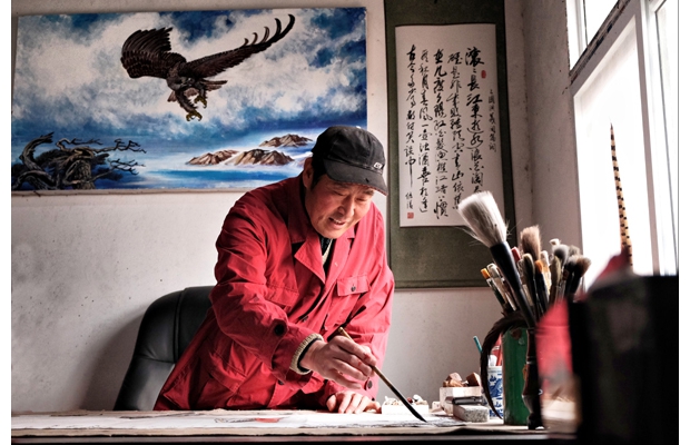 随州网讯 随州市随县吴山镇农民画家杜绍清40年潜心钻研书画艺术,其油画、国画、丙烯画作品多次参加国内外画展并获奖。图为杜绍清正在进行国画创作。 (记者 李文军摄)