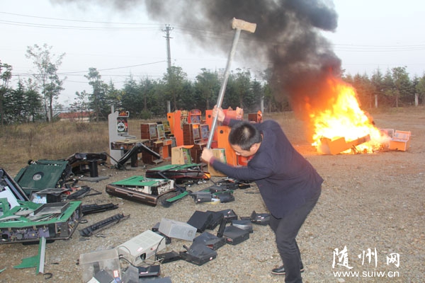 随州网讯   随州市公安局特警支队集中警力,共收缴捕鱼机、游戏机、麻将机50余台,毒品150余克,弓弩、管制刀具140余把。图为11月9日,随州特警正在销毁赌博机及管制刀具。 (本报记者 周强 通讯员 程昆 刘智明 摄)