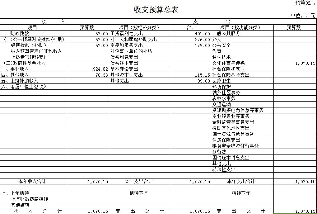 2015年收入预算1070.15万元,其中财政拨款收入67万元,经营收入924.82万元,其他收入78.33万元。