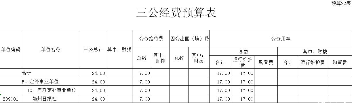 2015年,随州日报社“三公”经费预算支出合计24万元,其中:公务接待费7万元,公务用车运行维护费17万元,无因公出国(境)费用,“三公”经费预算支出比上年下降。