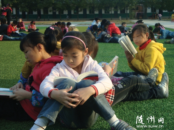 随州网讯   随州市随县厉山镇三河小学注重对孩子读书习惯的培养,通过举办读书月、读书会、“营造书香校园”等活动,开展丰富多彩的读书活动,与经典同行,让阅读成为师生日常的生活方式。图为孩子们午间在草坪上读书。(通讯员 王先春摄)