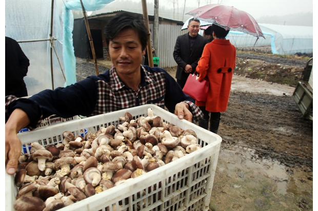 随州网讯 随州市曾都区洛阳镇农民正在大棚采摘蘑菇。该镇积极组织农民从事各种种植养殖项目,帮助农村贫困家庭脱贫致富。 (记者 孙洪涛摄)