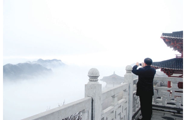 随州网讯 12月22日,雨后的大洪山,云海、雾凇和着重峦叠峰,在微风的作用下,似一幅不断变换的水墨山水画,吸引众多游客的驻足观赏。(贺晓利 摄)