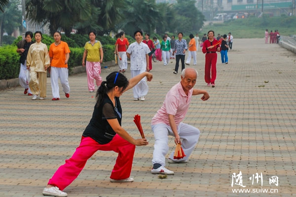 随州网讯  每天早晨随州市随县唐县镇居民聚在河边广场打太极拳、跳健身舞,享受和城里人一样的健康生活,全民健身运动正在该镇悄然兴起。 (记者 李文军 摄)