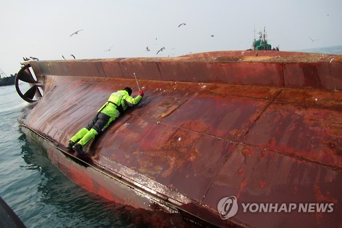 1月27日,在全罗南道新安郡黑山面可居岛西北方向85公里的海上,一艘中国渔船被翻船,韩国海警开展营救工作。(韩联社)