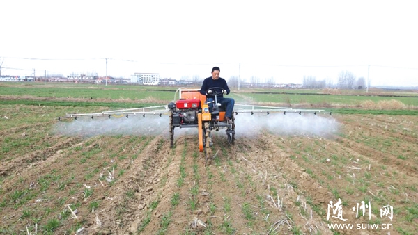 随州网讯  人勤春来早,当前正是小麦春管关键时期,随州市随县农科所积极推广农业新技术、新装备。图为该所2月18日下午在随县厉山镇星旗村推广示范机械喷药。(通讯员 杜波 摄)