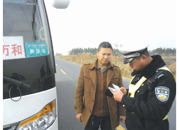 随州网讯 针对元宵节客流高峰,随州市随县交警在严查国、省道客运车辆超员的同时,兼顾对市县等低等级道路客运车辆的查处。图为2月19日该大队三中队民警利用中午时间段突查万净公路上营运客车,严把客运安全关。(通讯员 王大群摄)