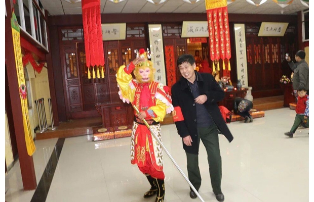 随州网讯 在派出所、城管和社区居委会的积极行动下,随州高新区淅河镇宝善寺庆元宵一“炮”未放,热闹非凡。图为市民争相与表演节目的“美猴王”合影。(本报记者 周 强 通讯员 陈国海摄)