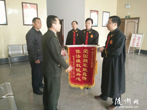 随州网讯  3月9日,随州市随县均川镇红石垭村二组村民魏某和随州军分区、武警随州支队的三名干部将一面写有“爱国拥军献真情,依法维权暖兵心”的锦旗送到随州市中级人民法院,对随州市中级人民法院民一庭法官在办案中依法维护军人家属合法权益的行为表示感谢。 (通讯员 张欢摄)