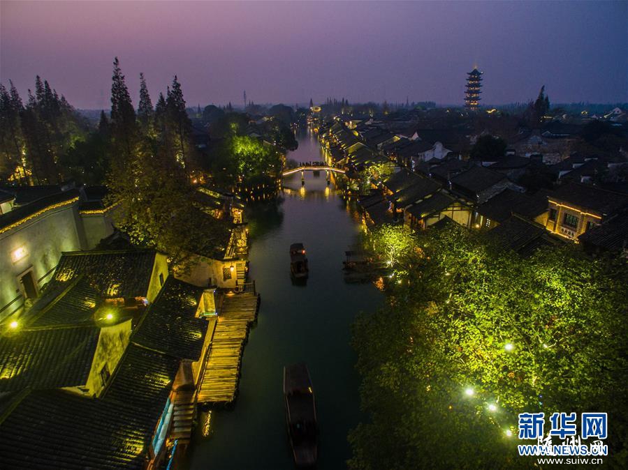 图为航拍到的乌镇西栅景区古镇夜色。浙江省桐乡市乌镇是一个有着1300年建镇史的江南水乡古镇,也是江南六大古镇之一