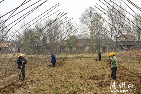 随州网讯  春耕时节育秧忙。图为广水市华华农业科技发展公司组织村民在骆店镇远景村整理育秧棚,培育供3000亩水稻机插的秧苗。 (记者 李文军 摄)