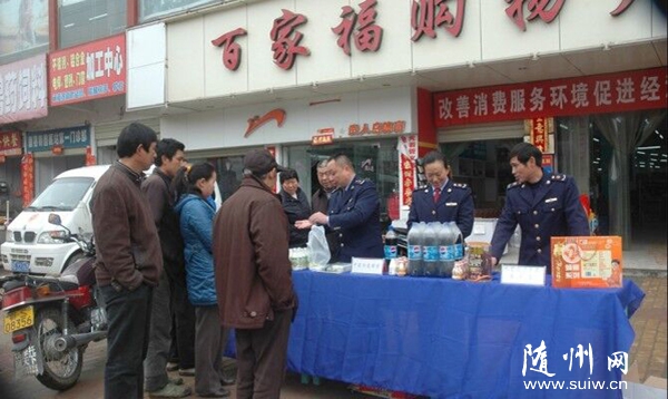 随州网讯  随州市随县唐县镇工商所执法人员走上街头,展示假冒伪劣产品,为群众介绍识别假冒产品的常识并宣传维权方法。(记者 周强 通讯员 冯波 摄)