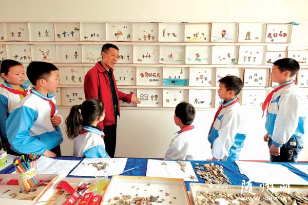 随州网讯  随州市随县环潭镇涢水小学阳光班班主任王从伦老师指导学生利用大自然中的石头和树叶等,拼出一幅幅造型优美、寓意深刻的石头拼画,激发学生的创意和灵感,接受美的熏陶。 (本报记者 李文军摄)