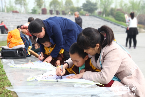 ◆春日里草长莺飞、花红柳绿,到处是一片生机勃勃的景象,家长们纷纷领着孩子来到户外,感受春暖花开的季节,增进和谐、亲密的亲子关系。图为4月8日在随州文化公园,家长与孩子一起在风筝上作画。(本报记者 王 天 摄)
