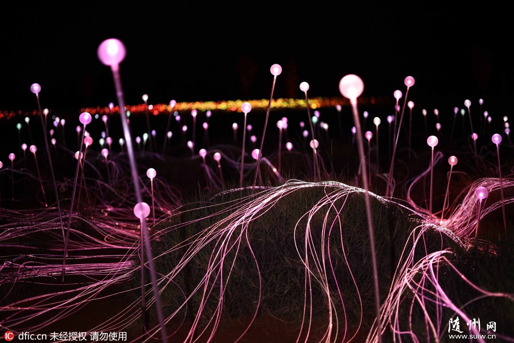 2016年4月13日报道,英国知名艺术家Bruce Munro震撼人心的艺术装置展“乌鲁鲁原野星”自4月1日开始在澳大利亚红土中心的乌鲁鲁艾尔斯岩度假村展出。为了与广袤的红土沙漠相适应,“乌鲁鲁原野星光”艺术装置展是Bruce Munro截止到目前为止最大的“原野星光”艺术装置展,由50000多个覆盖着磨砂玻璃球体的发光的管子组成,占地面积超过49,000平方米,相当于四个英超足球场的大小,同时这也是Bruce的首个依靠太阳能发光的艺术装置展。这些玻璃球体由一系列错综复杂的光纤网络连接,当夜幕降临在乌鲁鲁时,会在夜空中如花朵般怒放,美不胜收。参观者们将会通过特别设计的步道近距离欣赏“原野星光”,在南半球浩瀚的星空下从沉睡中逐渐苏醒,越夜越美丽。CB2ZOB/东方IC |