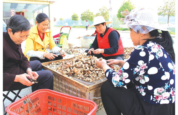 随州网讯 4月12日,年产香菇1300多吨的随州市随县老区环潭镇,将317个贫困户列入扶持种植香菇产业脱贫户。图为该镇柏树岗村村民,抢晴天分拣香菇晒干,提质增效。 (通讯员 石守京 摄)