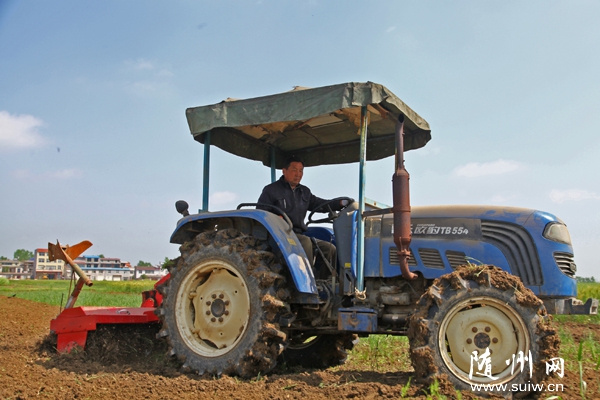 随州网讯  4月18日,随州高新区淅河镇漂水村村民驾驶旋耕机翻田整地,准备种植直播稻。(记者 王璟天摄)