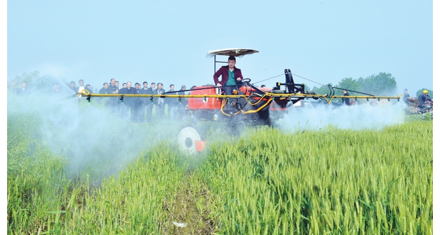 随州网讯 随州高新区淅河镇积极推广应用新技术,该镇日前在金屯村推广“一喷三防”等农业技术,促进小麦增产。(记者 孙洪涛 通讯员 王 涛摄)