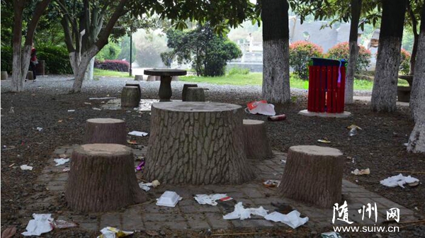 随州网讯  “五一”小长假期间,记者在随城白云公园发现,公园的地上随处可见游客们留下来的垃圾,希望广大市民改变随地乱扔垃圾这种不文明行为。(记者周强摄)