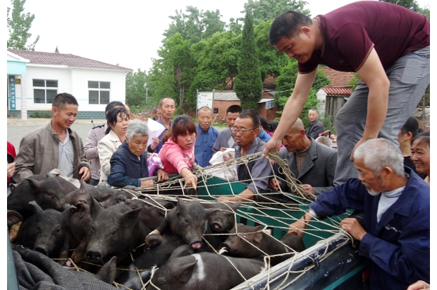 随州网讯 随州高新区认真贯彻落实精准扶贫要求,履行扶贫责任,采取多种措施,帮助农民脱贫致富。图为高新区党群局日前为淅河镇樊冲村21户贫困户送去37头生态黑猪。 (本报记者 孙洪涛 通讯员 黄群书 摄)