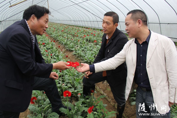 随州网讯  随州市曾都区何店镇150亩鲜花喜获丰收,元至4月,销售30多万元。图为曾都区科协负责人现场指导技术。 (通讯员 多思 摄)