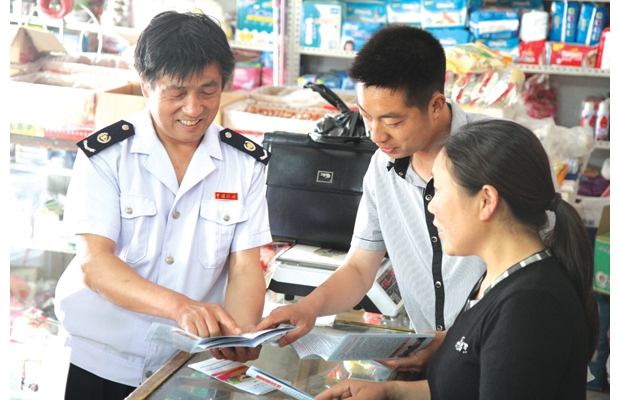 韩存锦(左一)生前在万和一超市宣传税收政策