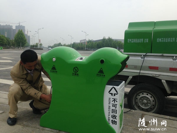 随州高新区管委会高度重视创卫工作,今年投资24万元购买转送箱75个、果皮箱87个、垃圾桶1072个,投放到各社区和主次干道。图为施工人员正安装果皮箱。(记者 孙洪涛 通讯员 黄勤书摄)