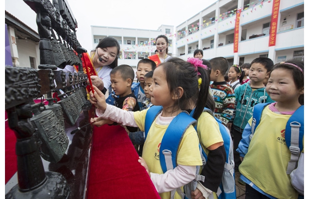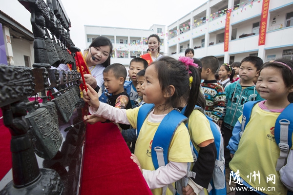 随州网讯 5月23日,随州博物馆“文化服务进校园”活动走进随县洪山镇朱集小学,让孩子们了解家乡的历史文化。图为孩子们在敲击编钟复制品。 (记者 徐斌 摄)