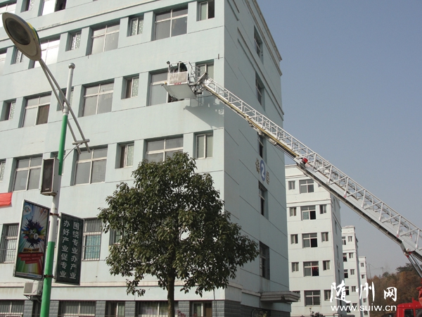 随州网讯  日前,为提高学院师生减灾应急能力,随州职业技术学院开展了应急避震、灭火展示、高空云梯救援等科目的演练。图为高空云梯现场救援演练的情景。(通讯员 张亦飞摄)
