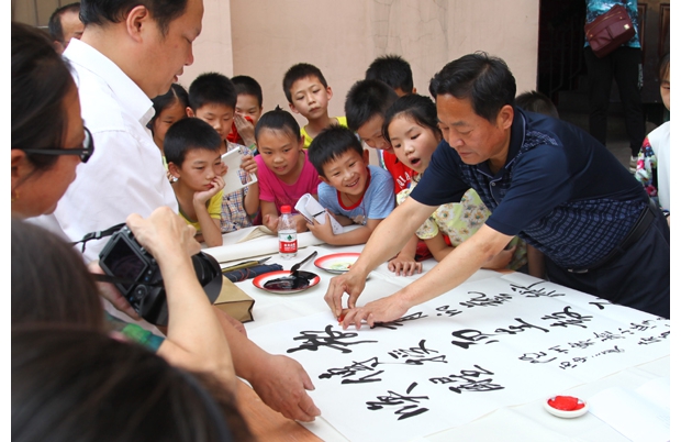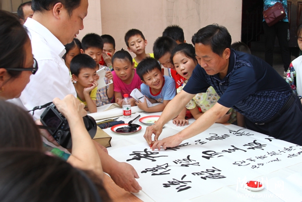 随州网讯 6月8日,随州市多名书画名家走进曾都区实验小学,与该校师生零距离交流,弘扬中国书画艺术。(记者 王璟天摄)