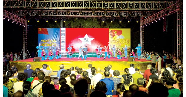 随州网讯 6月29日晚,随州市离退休老同志纪念中国共产党成立95周年暨红军长征胜利80周年文艺演出在神农公园举行,市领导王志勇、夏洪国、罗国银与市民一起观看了演出。 (本报记者 徐斌 摄)