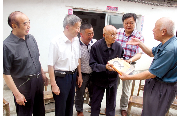 随州网讯 6月30日,随州市新四军研究会负责人和曾都区新四军研究会负责人等一行,到曾都区洛阳镇君子山村1组慰问新四军第五师89岁的老战士夏明资,送去了慰问金和《老区颂歌》、《李先念在随州》等革命书籍,共庆建党95周年。 (通讯员 肖显荣 石守京摄)