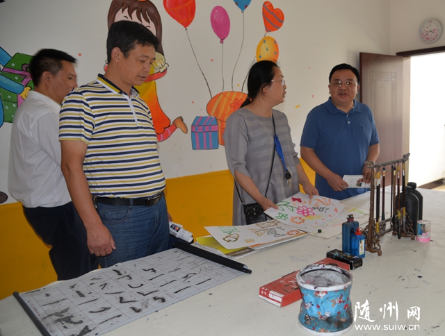 图为随州市邮政分公司干部职工到福利院参观孩子们的书画作品。