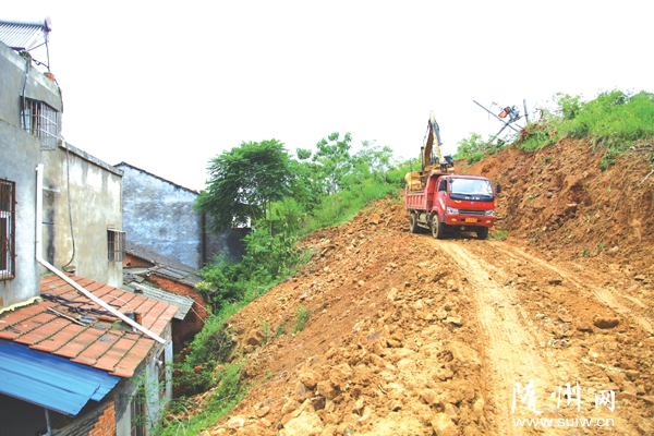 随州网讯  7月5日,随州市曾都区府河镇白河滩村卫生室房屋背后山体出现裂缝,该镇组织工程机械除险救灾,避免山体滑坡造成群众生命财产损失。(记者 王璟天摄)