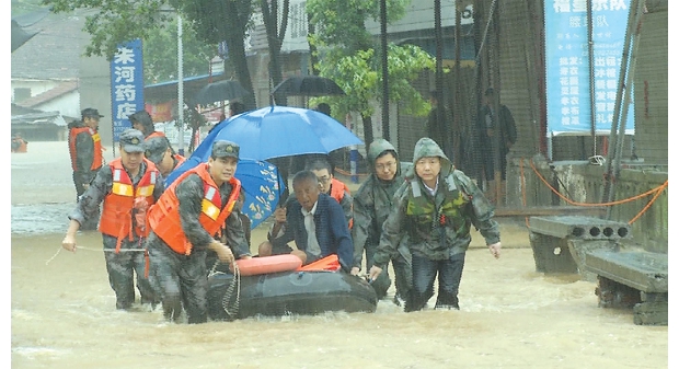 昨日上午,市委书记刘晓鸣(右一)、市长郄英才(右二)与救援官兵们一道,在曾都区府河镇清筑城村转移被困群众。(记者 徐斌摄)