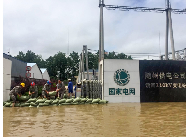 随州网讯 7月20日,国网随州供电公司员工齐心协力帮助随州高新区淅河变电站紧急垒起沙包墙抵挡洪水侵袭。 (记者 李文军 通讯员 龚昕 夏一菲 摄)