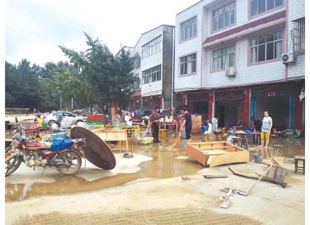 洛阳镇居民将家中被水浸泡过的家具等进行清洗减少损失