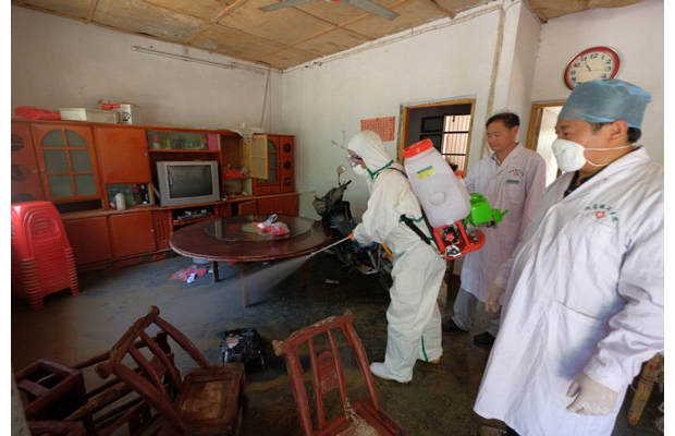 随州网讯 “7·20洪灾”发生后,随州市曾都区何店镇卫生院及时开展灾后防疫工作,成立3个工作专班分赴各个灾区分发防疫知识传单,发放消毒药品等。图为7月22日医务人员正在该镇辽原村农户家中喷洒消毒药剂。(记者 李文军 摄)