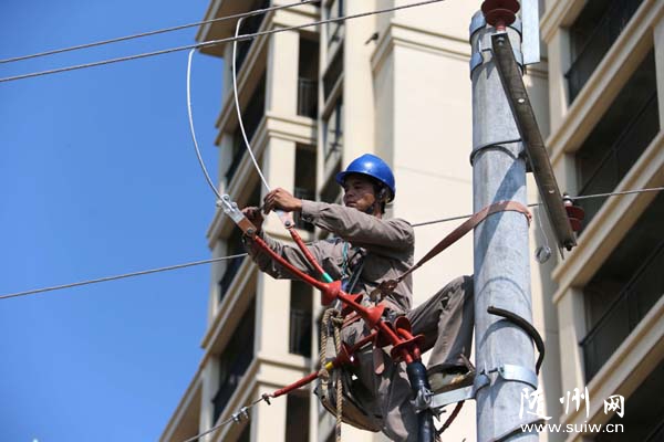 随州网讯 七月二十七日,国网随州供电公司员工顶着烈日高温在随县尚市镇净明街道处理台区缺陷,让群众用上安全电。(通讯员 匡志鸿摄)