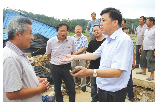 随州网讯 八月八日,华中农业大学教授边银丙(前右一)一行,来到华中农大科研教学基地、曾都区洛阳镇九口堰富民蘑菇专业合作社,慰问菇农,指导灾后生产技术。(通讯员 刘毓 石守京摄)