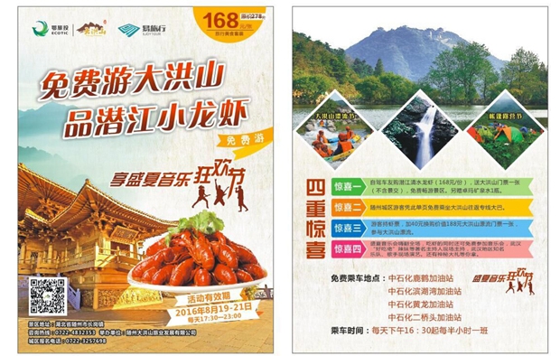 ★ 吃龙虾免费乘大巴168元(每天下午16:00由随州发车,半小时一趟)★ 大洪山门票+景交=118元/人;★ 大洪山漂流+大洪山门票+景交=158元/人;★ 加入后备厢集市+大洪山门票+景交80元/人。详情咨询电话:0722-4832353