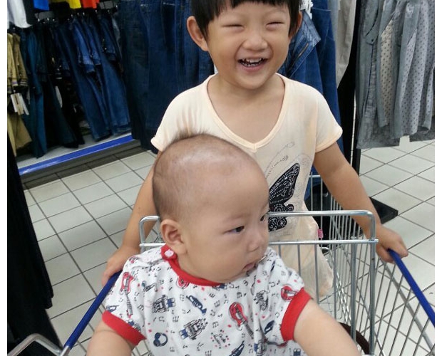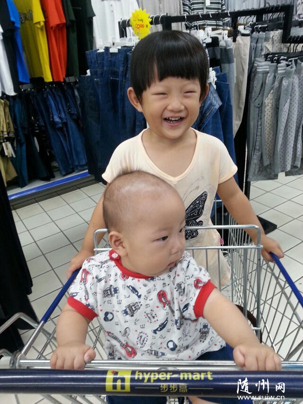 姐姐推着弟弟逛超市