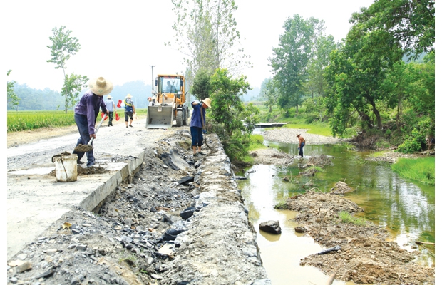 随州网讯 7月份的暴雨让随州市部分乡村道路严重损坏,各级政府及部门全力支持灾后重建,恢复群众正常生产生活。图为8月22日,曾都区何店镇组织人员对该镇燎原村一处沿河路面进行修缮。 (本报记者 王璟天 摄)