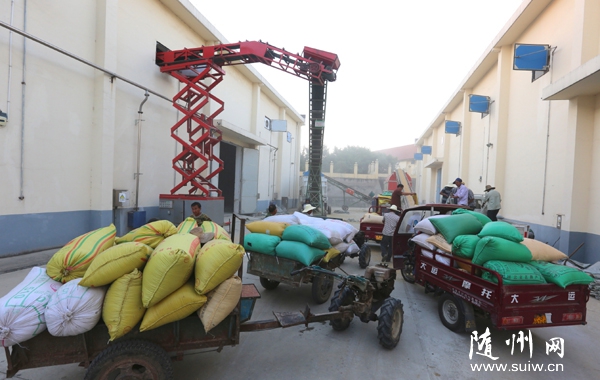 随州网讯  近日,随州市启动2016年中晚籼稻最低收购价预案,全市第一批50个最低收购价收储库点开仓挂牌收购。图为随县国家粮食储备库正在收购秋粮。(记者 徐斌摄)