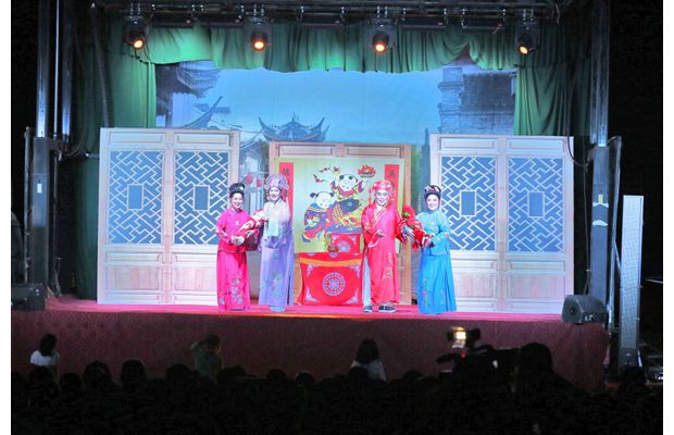 随州网讯 9月27日,随州市“戏曲进校园”观摩推进会在随县厉山三中举行,市委常委、宣传部长、副市长王志勇出席并致辞。图为天韵文化传媒有限公司演员为厉山三中师生演出花鼓戏《状元与乞丐》。 (记者 徐斌 摄)